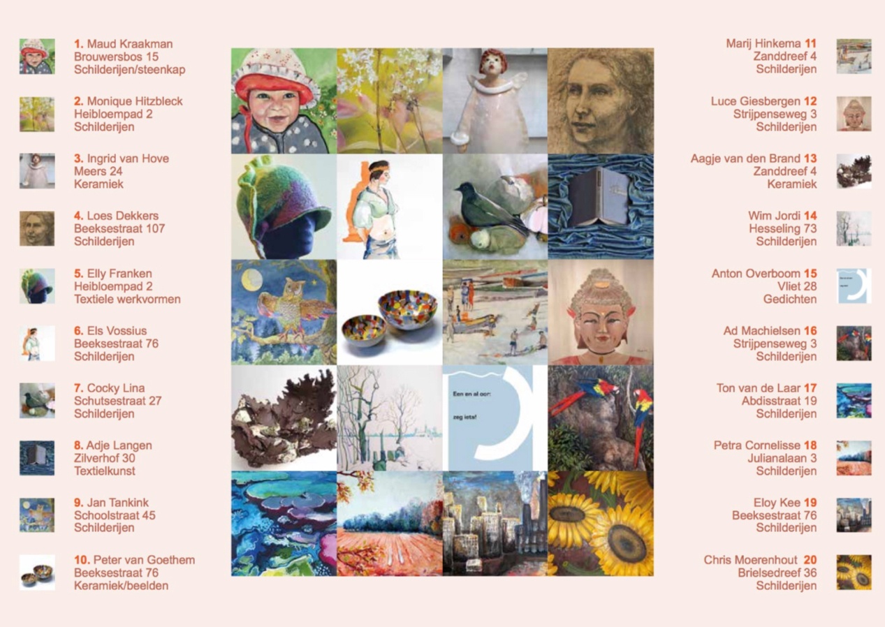 De adressen zijn herkenbaar zijn aan een vlag met kunstroutelogo. Naast schilderijen omvat de kunstroute ook beelden, keramiek, textiel, gedichten e.d. Naast de 14 kunstenaars die al eens ooit eerder deelnamen zijn er ook 6 nieuwe deelnemers.
