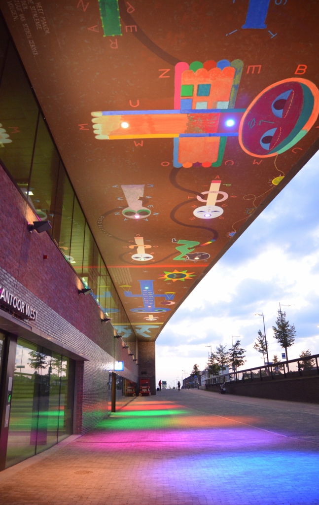 Ter plaatse van de fietsenstalling aan de Belcrumzijde is onder de overstek – zeg maar de vloer van het belastingkantoor – een plafondschildering aangebracht. Alienachtige figuurtjes en teksten in plechtstatige stijl sieren het plafond in vrolijke kleuren. De schildering is in opdracht van het Rijksvastgoedbedrijf gemaakt door Derk Thijs uit Amsterdam.