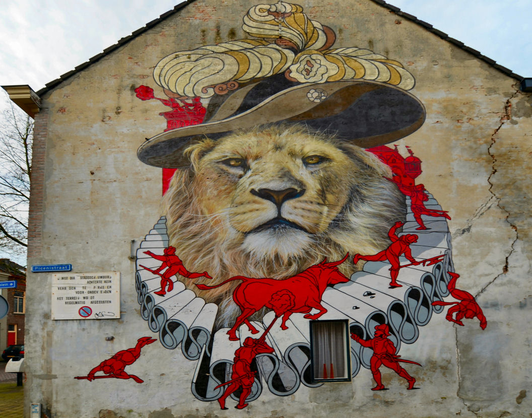 Van hem is maar één afbeelding bewaard, met een uitbundige hoed en een krans om zijn nek. De leeuw op de muurschildering draagt zo’n zelfde hoed. De kunstenaar gebruikte de krans als een soort van trap naar de stad. Rond de krans zijn diverse soldaten afgebeeld. De stier verwijst naar de Spaanse bezetters in de Tachtigjarige Oorlog.