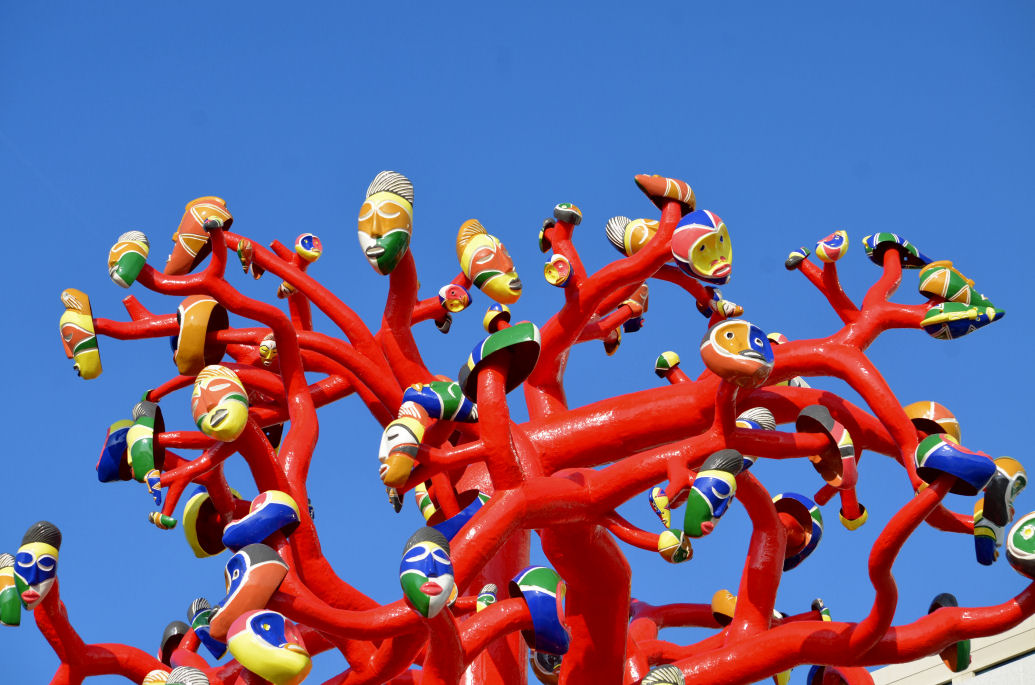 De boom is geplaatst in het midden van een bassin met een doorsnede van ca. 11 meter voor de entree van het gebouw. Op de bodem van de fontein zijn met blauwe lijnen de contouren van de continenten van de wereld weergegeven, maar deze zijn eigenlijk alleen maar goed te zien hoog vanuit de verdiepingen in de nieuwe hoogbouw. Uit de stam van de boom stroomt met tientallen stralen water in de fontein. In de rode boom hangen tientallen maskers die de diversiteit van mensen uit alle culturen over de hele wereld symboliseren. De boom met het stromend water en het bassin vormen samen een fontein en nodigen uit voor een moment van overdenking.