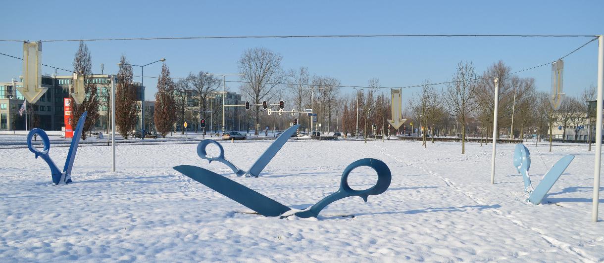 Omschrijving: sculptuur van 4 scharen en verlichte pijlen