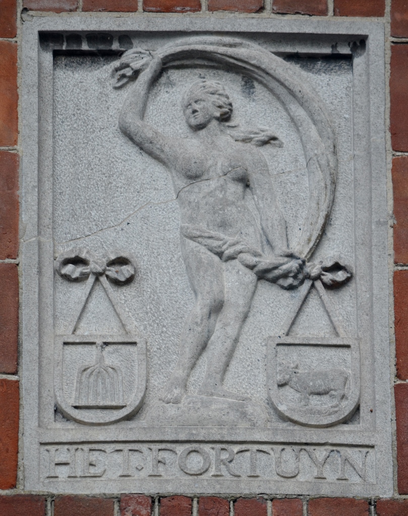 Het verhaal van deze gevelsteen gaat terug naar het jaar 1800. Een timmerman uit het Ginneken kreeg de opdracht van de gemeente om een molen te bouwen. De molen Het Fortuyn, gebouwd in 1838, bevond zich aan het Van Coothplein schuin tegenover Concordia. Boven de ingang werden 2 gevelstenen geplaatst. De steenhouwer vond het niet nodig een zedig geklede patroonheilige af te beelden, maar hakte de Griekse godin Vrouwe Fortuna uit in haar volle goddelijke glorie met om haar heen een sierlijk gedrapeerd molenzeil. Het was een gemeentelijke opdracht dus werd zij links en rechts voorzien van twee symbolen uit het wapen van de gemeente Ginneken en Bavel, het rooster van Laurentius en de koe, die verwijst naar de Bavelse patrones St. Brigida. Het is opvallend dat gemeentewapen van het Ginneken werd gebruikt – de plaats waar de timmerman vandaan kwam – terwijl de molen in Breda stond. Op de tweede steen staat het jaartal 1800. Ruim een eeuw heeft de molen gedraaid. Toen drong de industriële revolutie door en werd door de toenmalige molenaar Victor van de Reijt een grote dieselmotor aangeschaft en de wieken werden verkocht. Tot 1958 bleef Het Fortuin als machinale maalderij in gebruik. Daarna werd het door houthandel Hoteb als opslag gebruikt, om in 1985 in brand gestoken te worden, en een jaar later gesloopt. De reliëfsteen is daarbij bespaard gebleven.