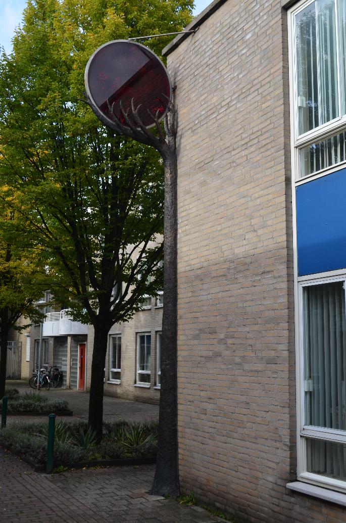 Deze sculptuur bestaat uit twee delen(bomen) met doorzichtige cirkels in de takken, die tegenover elkaar aan muren van woonhuizen zijn bevestigd. Het werk vormt de
