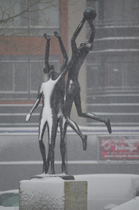 Omschrijving: Beeld van drie balspelers, gesigneerd “de Monchy ’69”, zonder opschriften.