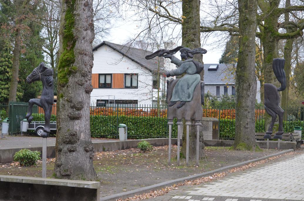 Bezoekers van de school zullen drie abstracte donkerbronzen sculpturen van verschillende grootte passeren. Van voren zien ze goudbruine fragmenten van een vrouw en een paard. Bij de ingang van de school nodigt een bronzen kijkpaal de bezoekers uit door een ‘perspectiefopening’ te kijken en de complete installatie te aanschouwen: Mencia de Mendoza, die in haar volle glorie tussen de bomen galoppeert met een gevederde vriend op haar hand. De installatie speelt met de illusie dat er één manier zou zijn om de wereld te bekijken. Het krijgt vanuit verschillende hoeken een ander aanzien. Het tweezijdig kleurontwerp(donkerbruin/goud) verwijst naar de vooruitgang van donker(onwetendheid) naar licht(kennis).