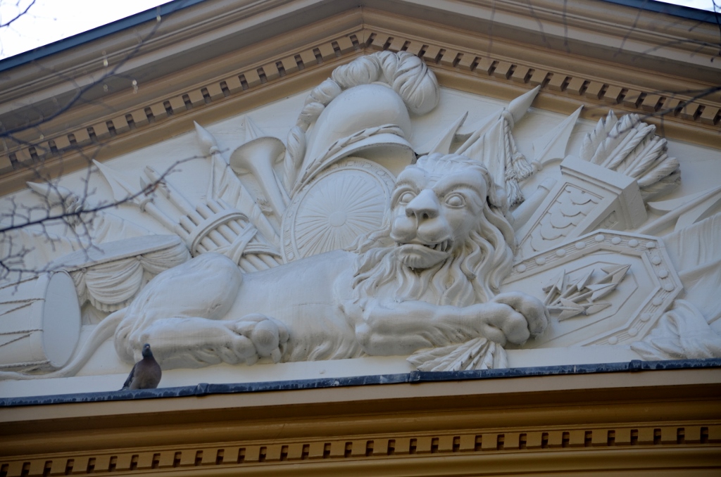 Het ornament vertoont best veel overeenkomsten met het timpaan op de stadshouderspoort van de KMA die er schuin tegenover ligt. Op de afbeelding zien we een leeuw met militaire attributen zoals pijlen, een schild, een hoorn en een trommel. De leeuw houdt 7 pijlen vast. Dit is vastgelegd bij het Koninklijk Besluit van 10 juli 1907. De 7 pijlen staan voor de Zeven Provinciën waaruit de Nederlanden ontstaan zijn in 1579. Deze leeuw heeft echter maar 6 pijlen vast. Dit komt omdat de afbeelding is gemaakt voordat het Koninklijk Besluit werd genomen. De beeldhouwer hoefde zich toen nog niet aan de regels te houden.