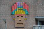 Aanvankelijk waren deze kunstwerken niet geschilderd en ietwat saai op de gevel aanwezig. In 2011 zijn de kunstwerken vrolijk geschilderd.