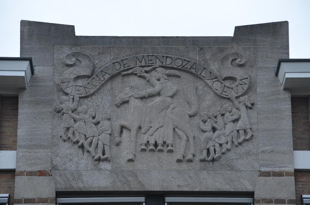 Deze gevelsteen bevindt zich boven de entree van de Mencia de Mendoza lyceum. De gevelsteen toont Mencia de Mendoza, die in haar volle glorie in amazonezit galoppeert met een gevederde vriend op haar hand. Links en rechts van staan schoolmeisjes.