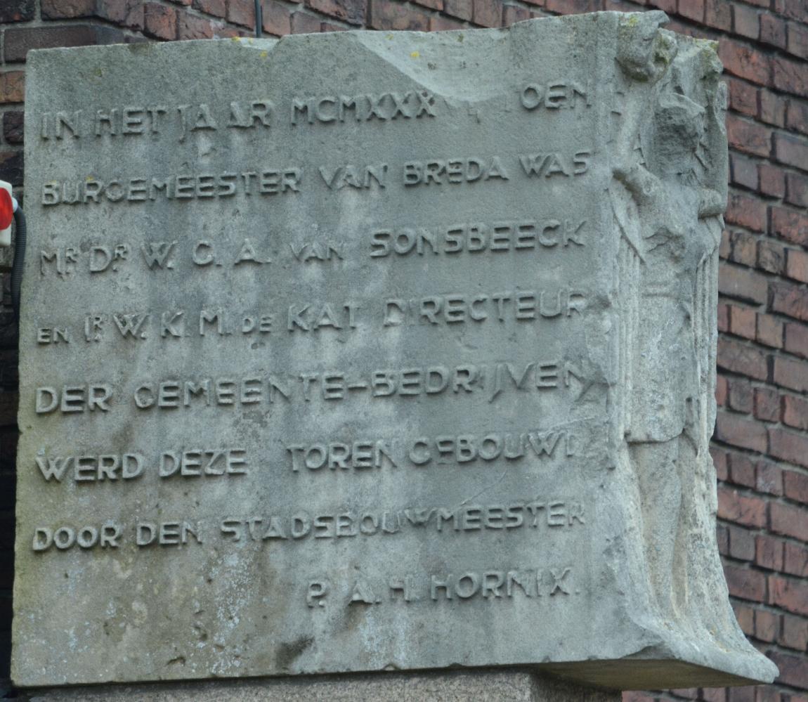 Aan de linkerzijde valt te lezen: “IN HET JAAR MCMXXXV TOEN BURGEMEESTER VAN BREDA WAS Mr. Dr. W.G.A. VAN SONSBEECK EN Ir. W.K.M. DE KAT DIRECTEUR DER GEMEENTE-BEDRIJVEN WERD DEZE TOREN GEBOUWD DOOR DEN STADSBOUWMEESTER P.A.H. HORNIX”