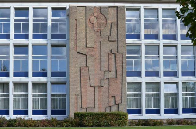 Dit metselwerk is reeds aangelegd bij de nieuwbouw van de school. Het bevindt zich aan de voorzijde van het gebouw en strekt zich uit over 3 verdiepingen. Voorheen heette de school KTS (katholieke technische school) Blauwe Kei. De verwijzing naar de Blauwe Kei is opvallend omdat in principe de school het Sportpark ligt.