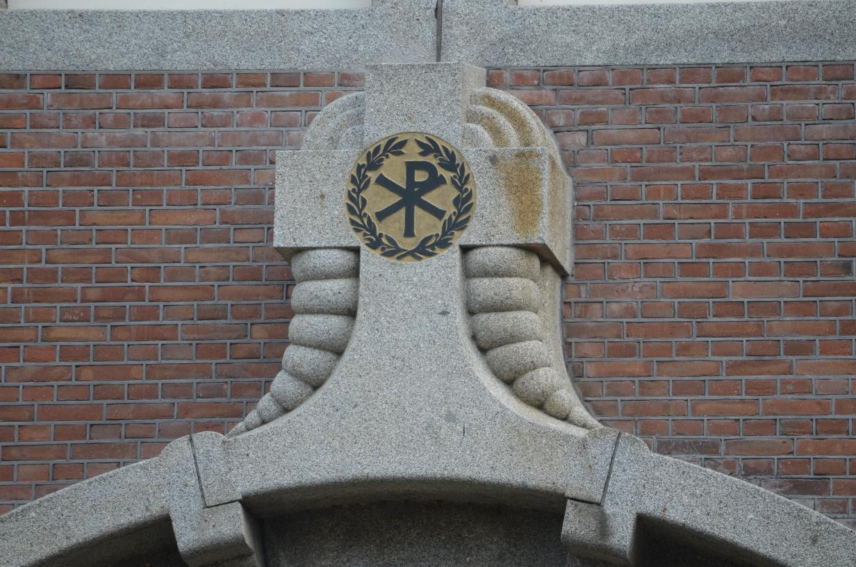 Bovenin zien we het Christusmonogram omsloten door twee olijftakken. Het Christusmonogram, ook wel Christogram of chi-rho genoemd, behoort – naast het kruis en het ichthussymbool (de vis) – tot de belangrijkste symbolen om Jezus Christus mee aan te duiden (vooral in de late oudheid). Het is een verwijzing naar het oudere zonnerad.