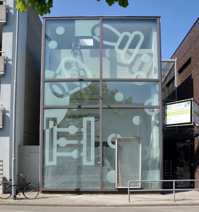 Deze decoratie is ontworpen door de architect van het gebouw. Deze gevel met geëtst glas is de enige in Breda.