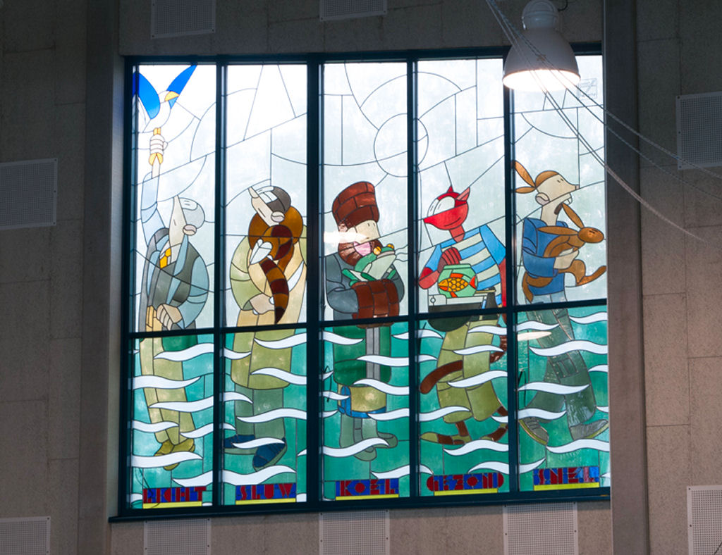 In navolging van de ijsheiligen stellen de Glas-in-lood ramen elk een voorstelling van een zwemheilige voor. Ze verbeelden een eigenschap waarover een goed zwemmer moet beschikken. Net als de schutspatronen op kerkramen heeft elke heilige een attribuut bij zich. De kunstenaar koos hiervoor een dier dat over dezelfde eigenschap beschikt als de zwemheilige. Van links naar rechts: Licht houdt een vogel in de hand, Sluw heeft een vosje rond de nek, Koel draagt een kikker, Gezond duwt een bootje met een vis in een kom aan boord en Snel heeft een haas vast.