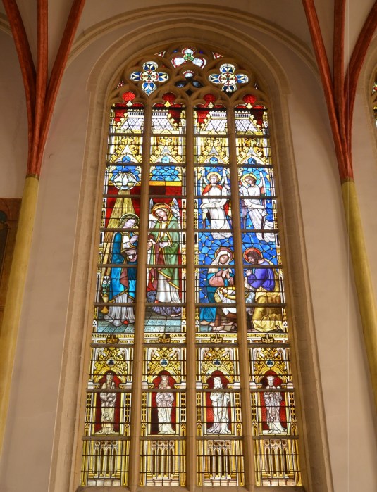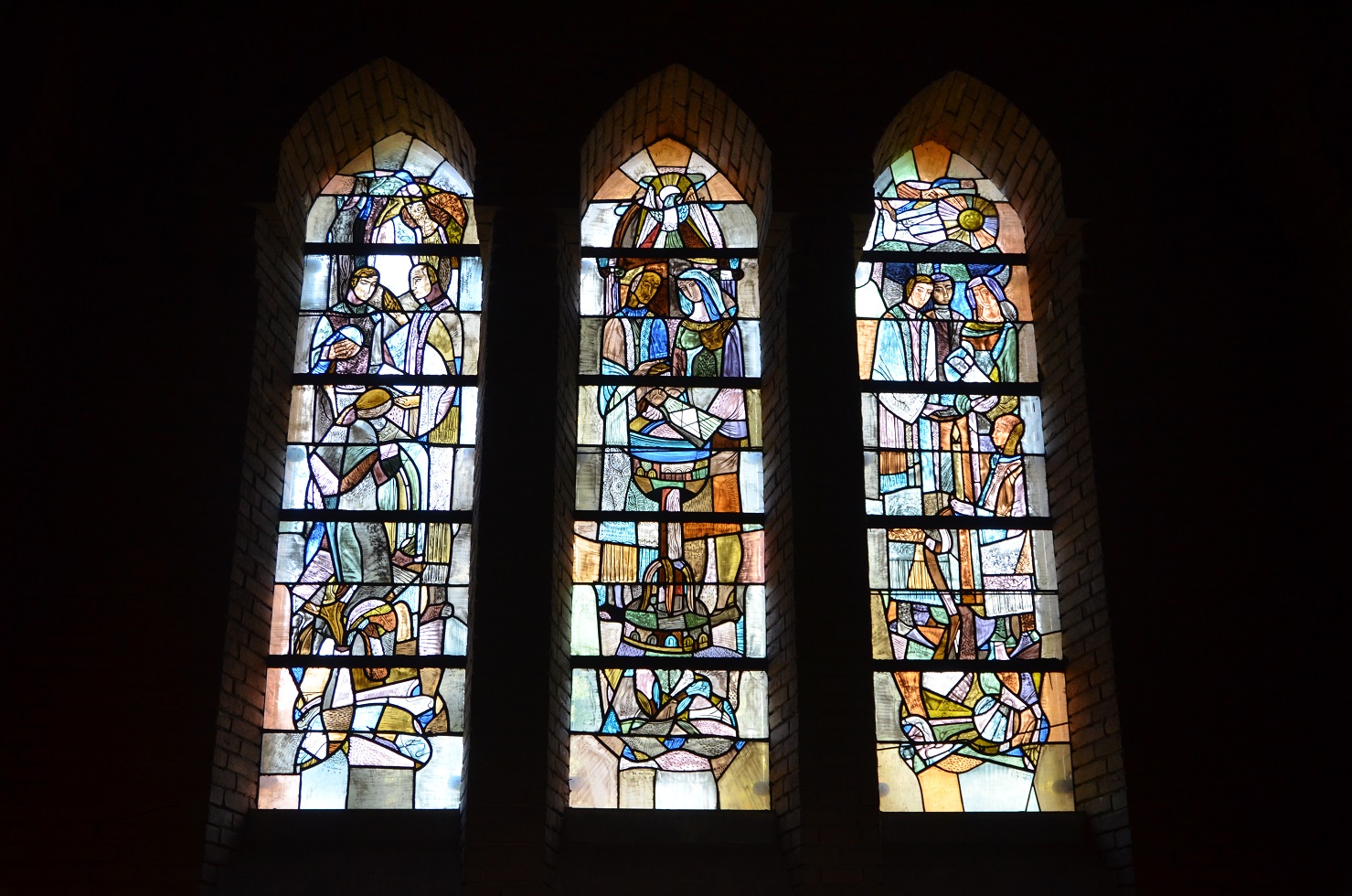 De negen vensters in het priesterkoor zijn nog geheel in tact. Ze tonen de grote momenten uit het leven van Christus. Van links naar rechts zien we: