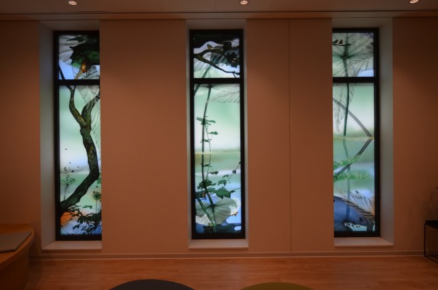 Voor de kunstwerken werd gebruik gemaakt van digitaal geprinte en ingebrande emailles op glaspanelen. Het werd uitgevoerd door Wimmer Glas Projecten Haelen Nederland en AGC Mirodan Heule België. Afmetingen ramen: 6 stuks 0,65 m x 2,75 m (b x h). Afmetingen deuren: 2,20 m x 2,30 m (b x h).