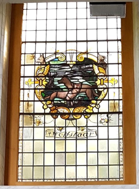 Het venster bevindt zich op de verdieping van de traphal. In het glas zien we onder andere drie wolven, een (roof?)vogel en bloemen.