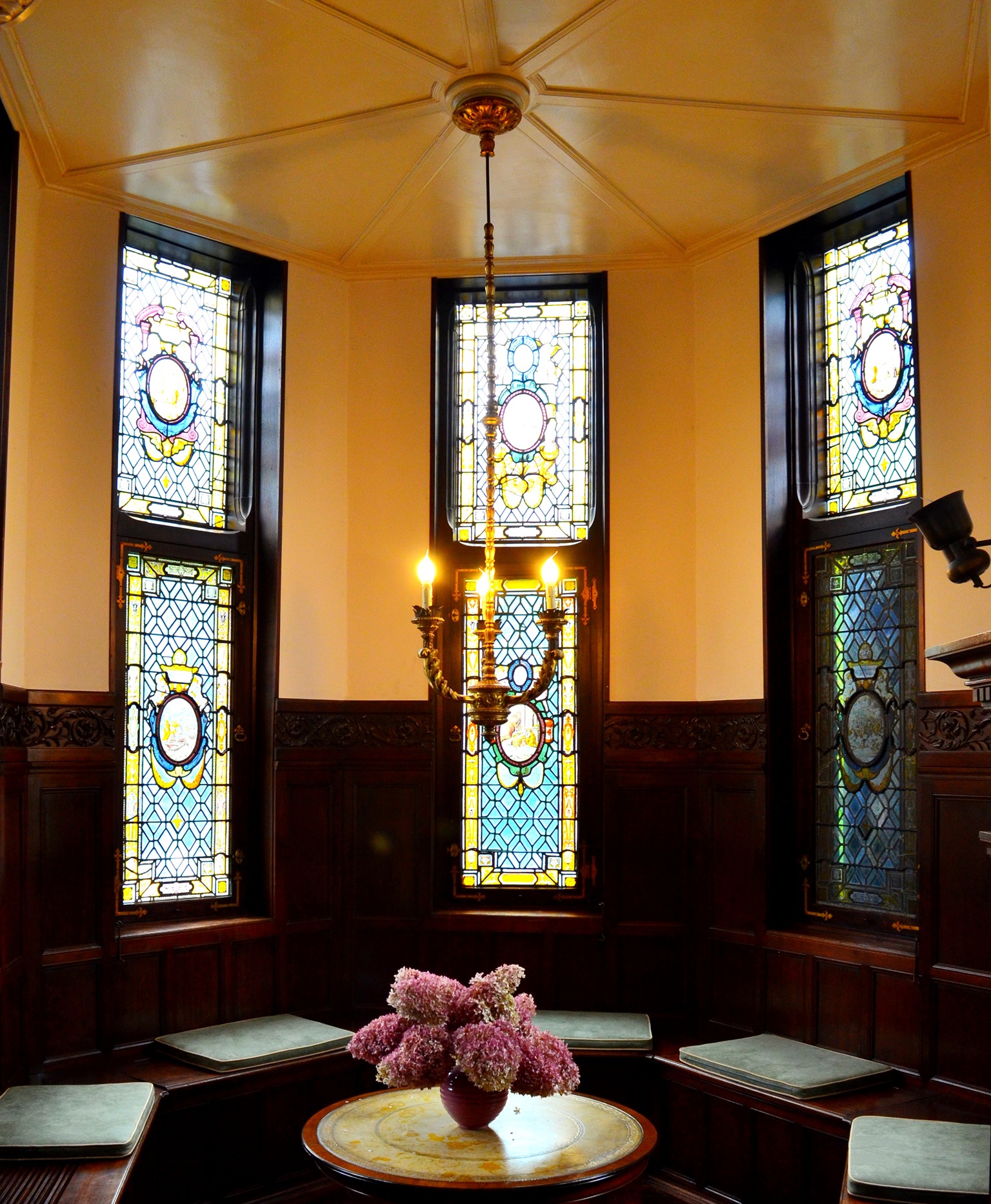 In het trappenhuis zijn tien glas-in-loodramen aangebracht met afbeeldingen van de allegorieën over de zes deugden, die een goed bestuur nastreven.