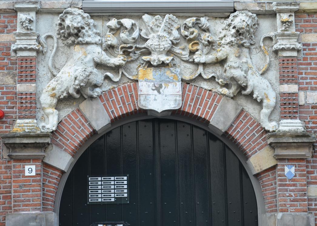 Omschrijving: gevelornament met leeuwen en familiewapen