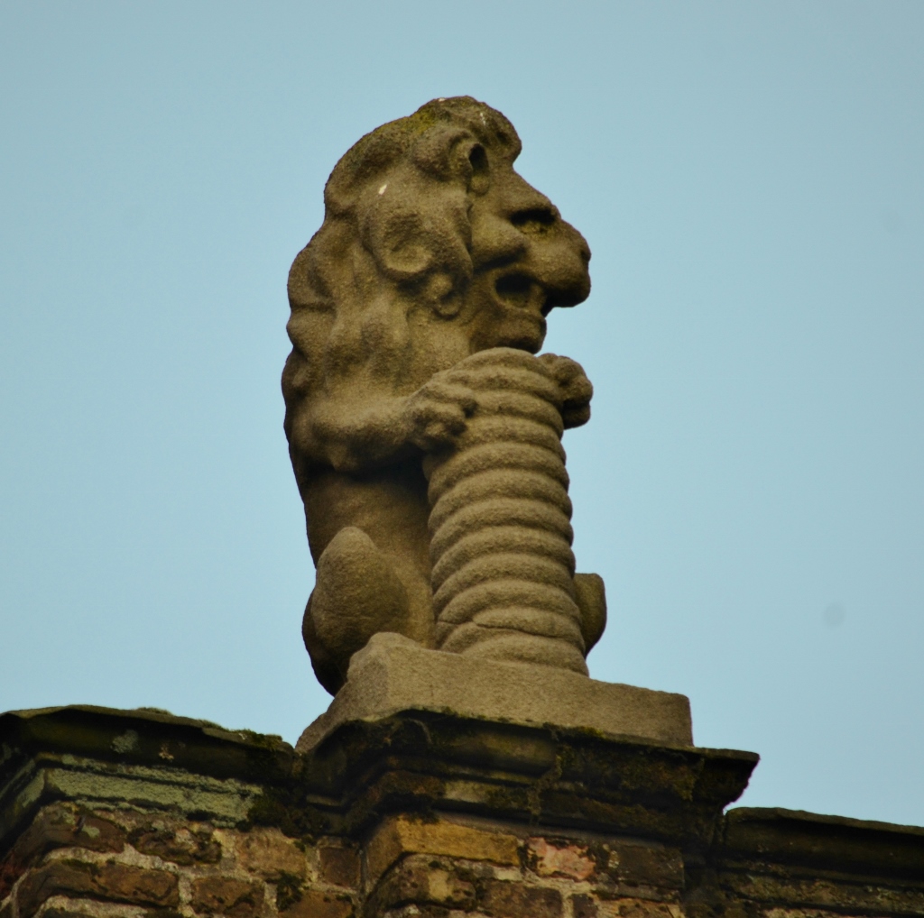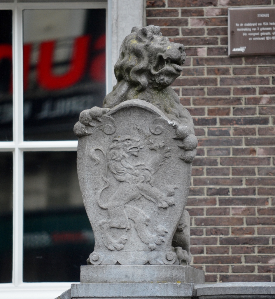 Deze leeuw staat hoog bovenop de trapgevel van het historische pand. Eigenlijk is het een heel bijzondere situatie, want leeuwen staan normaliter op overheidsgebouwen en meestal met zijn tweeën. Kijk maar eens naar de balustrade van het oude stadhuis op de Grote Markt. Meestal hebben dan de leeuwen een wapenschild tussen de voorpoten. Deze leeuw wijkt dus van het traditionele; hij heeft geen wapenschild maar een (?) tussen de voorpoten. Het voorwerp zou een koker kunnen zijn waar de pijlen van een boog in opgeborgen werden.