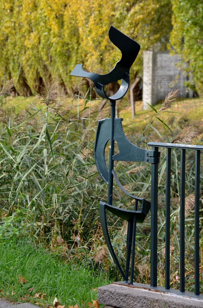 Voor het siersmeedwerk in de brugleuning heeft de kunstenaar zich laten inspireren door de natuur in de stedelijke omgeving. De elementen water, planten en vogels zijn duidelijk te waarneembaar. De leuningen worden aan weerszijden ingeklemd door ‘brugwachters’ op de hoeken. Zij markeren de landhoofden, de steunpunten voor de brug en vormen zo herkenningspunten op de weg.