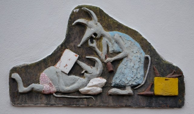 Omschrijving: gevelsteen met twee muisjes die de krant lezen