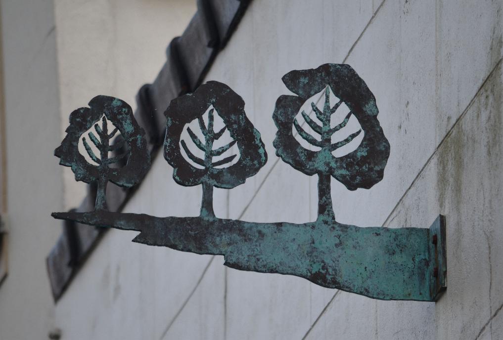 Het koper uithangbord is behandeld met een coating waardoor het zijn rode kleur behoudt.