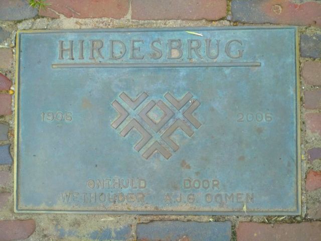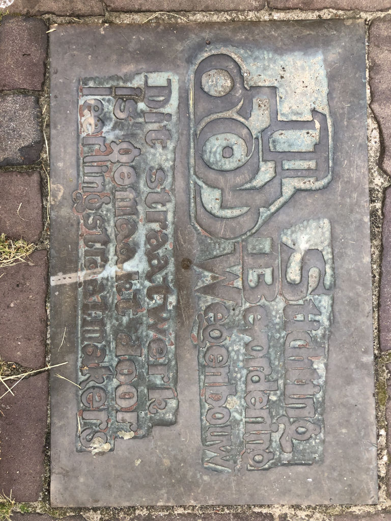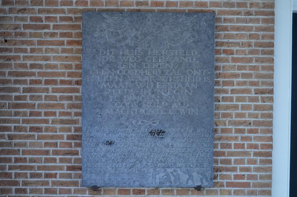 Opschrift: Dit huis hersteld, de weg gebaand, een teken: Geen goedheid zal ontbreken waar wijsheid is, maar wij bestaan reeds in ’t begin te dingen naar Gods hulp als machtigste gewin.