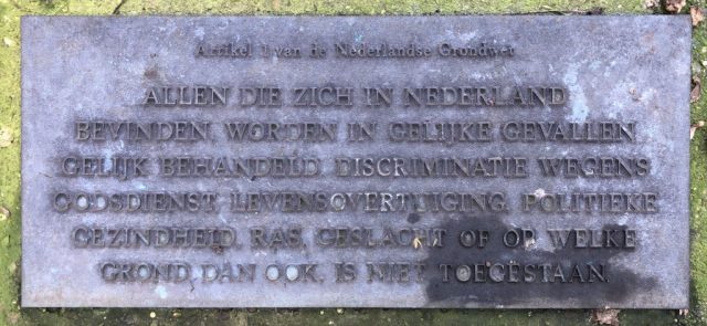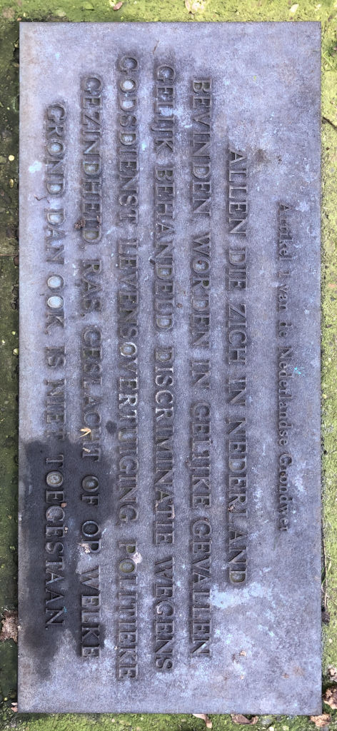 Op de gedenkplaat is de volledige tekst van Artikel 1 van de Nederlandse grondwet aangebracht. Met dit monument hebben de tolerantie en het principe van antidiscriminatie symbolisch een vaste plaats gekregen.