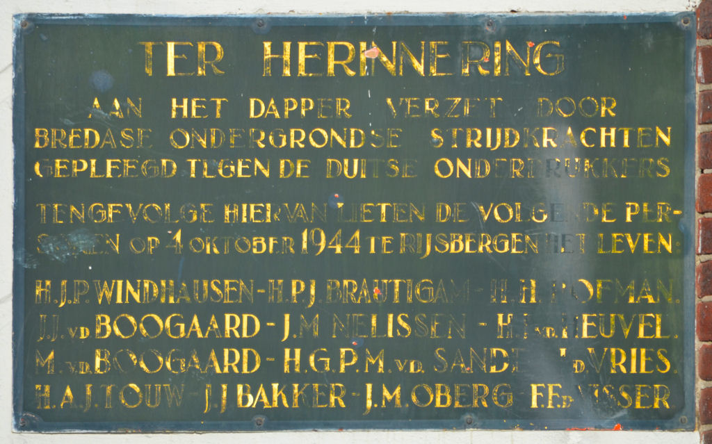 De verzetsmensen N. Brautigam, C. v.d. Boogaard, H. Hofman, F. de Visser, J. Bakker, J. v.d. Heuvel, J. Nelissen en J. de Vries werden door de bezetter gearresteerd en op 5 oktober 1944 in een bos bij Breda gefusilleerd.