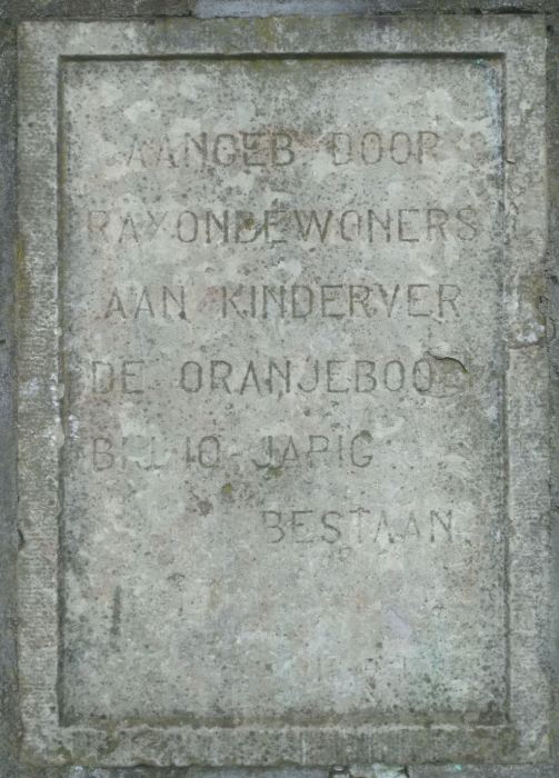 Inscriptie: Aangebod door Rayonbewoners aan kinderver de Oranjeboom bij 10-jarig bestaan.