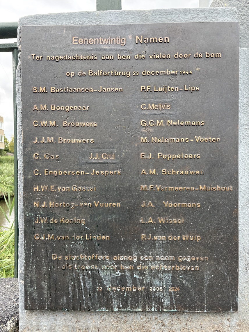 De monumentale betonnen lantaarnpalen op de brug werden door het bombardement weggevaagd en na de oorlog niet meer hersteld. In 2005 werd de brug gerenoveerd en werden er twee reconstructies van de oude lantaarnpalen geplaatst. Op vrijdag 23 december 2005, 61 jaar na het bombardement, werd een gedenksteen onthuld met de namen van de slachtoffers. Ten tijde van het maken van die plaquette waren er twintig dodelijke slachtoffers bekend. Hun namen staan op de plaquette.