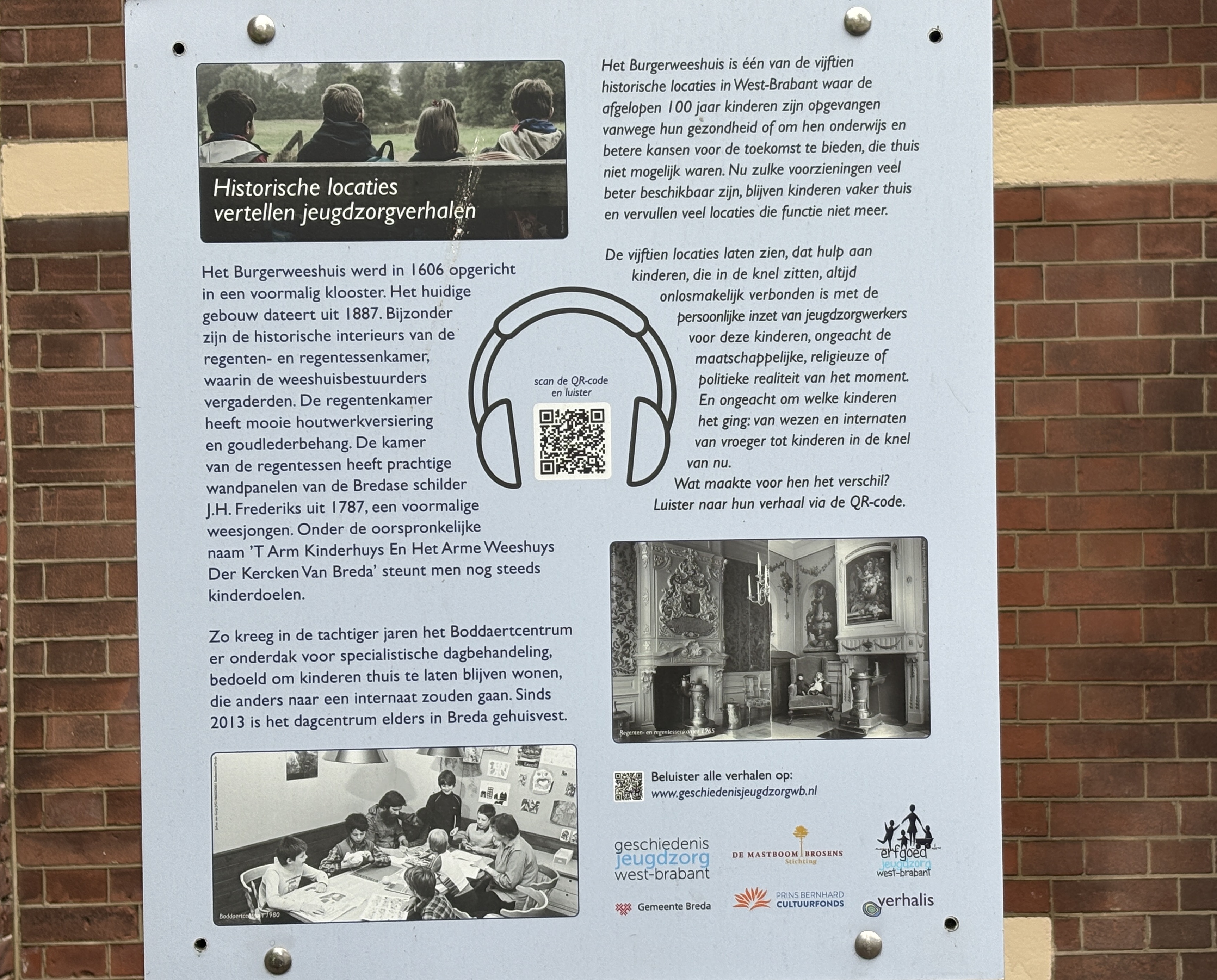 De gedenkplaat is een geschenk van het Comité Kristallnachtherdenking aan de stad Breda. Dit comité bestaat uit: Amnesty International, Diakonie Breda, Nederlands Israëlitische Gemeenschap Breda, Risala, platform van Marokkaanse organisaties, Stichting Nieuwkomers en VluchtelingenWerk, Molukse wijkraad, Stichting Akabe, Anti Fascistische Actie, Jongerenpastoraat Breda, Museum Oorlog en Vrede, COS, Vertizontaal, Palet, steunpunt voor multiculturele ontwikkeling in Noord-Brabant en het Steunpunt tegen discriminatie West-Brabant en staat onder voorzitterschap van journalist Rob Cremer.