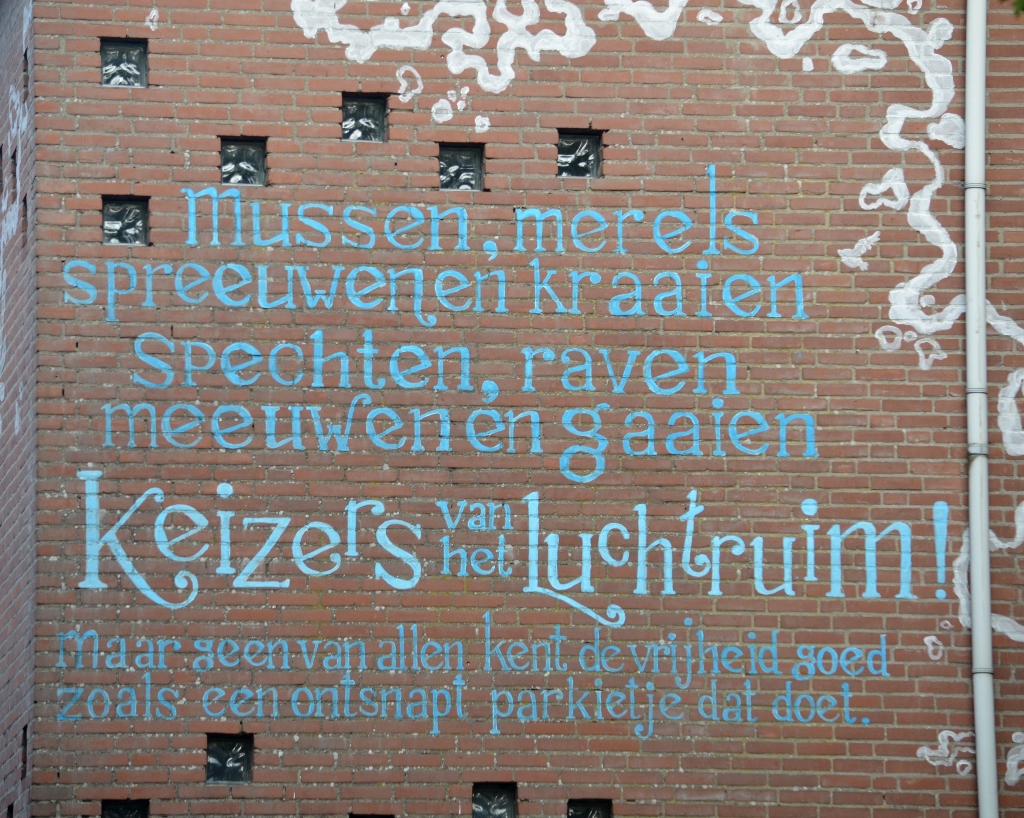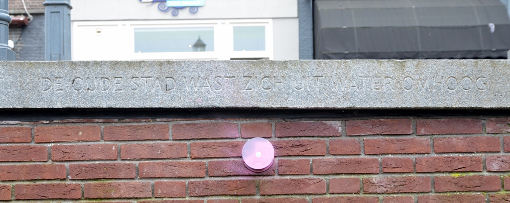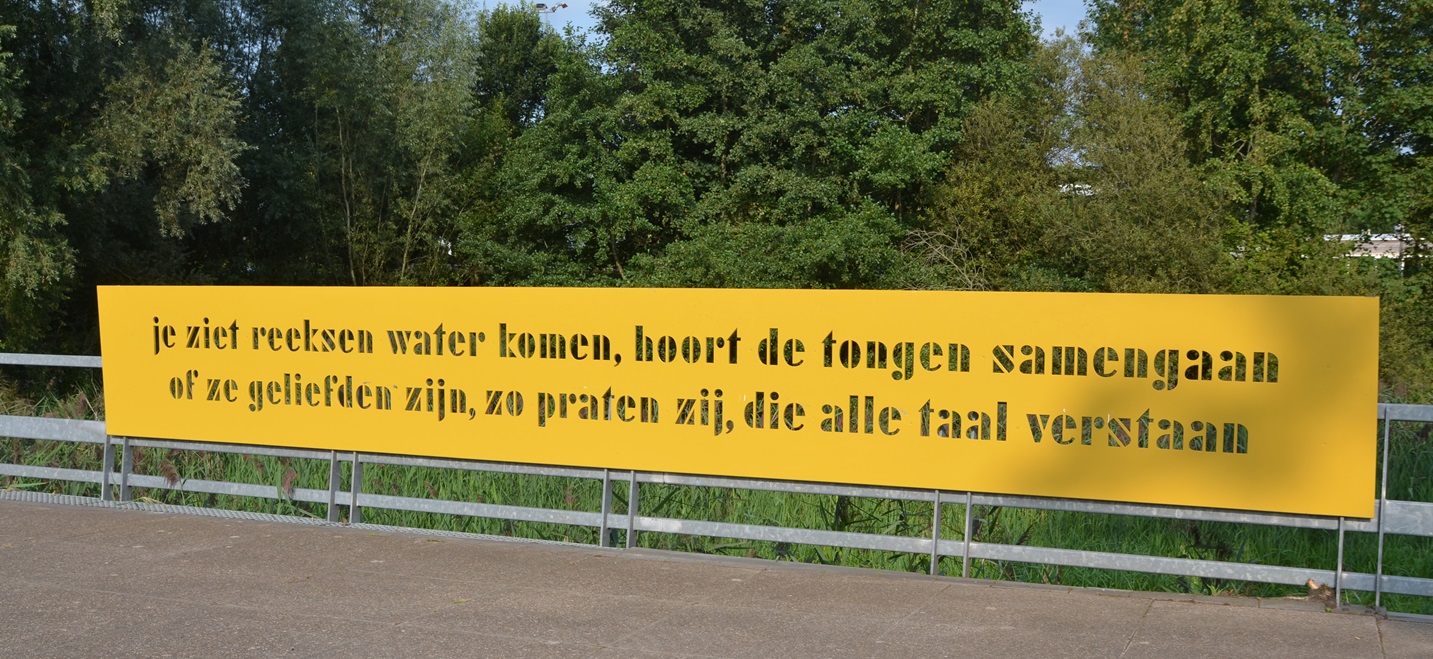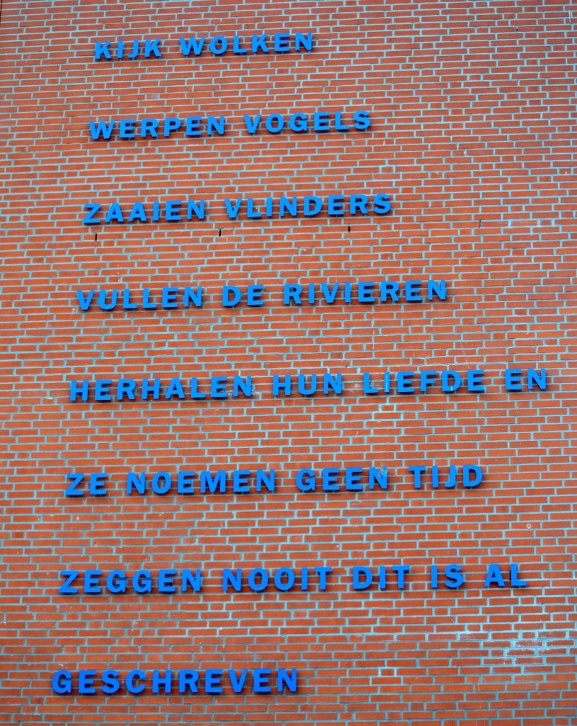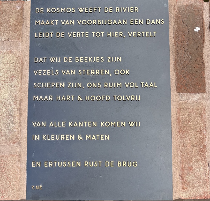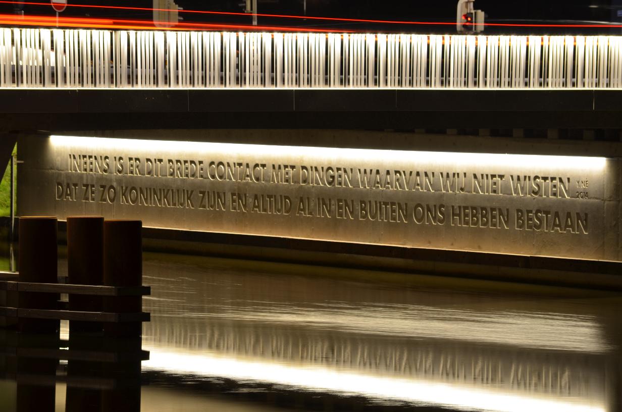 – Uitgefreesde teksten in de bakstenen kademuren van de Tolbrug: “VOORBIJGAAN & DANSEN”