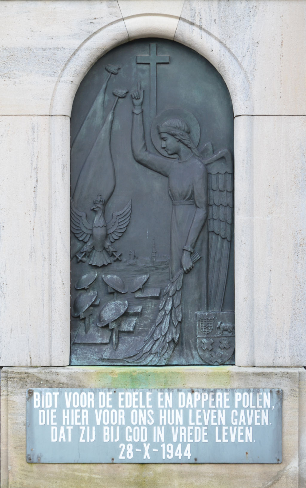 Onderin de sokkel is gegraveerd: DANK AAN ONZE POOLSE BEVRIJDERS 29 OCTOBER 1944.