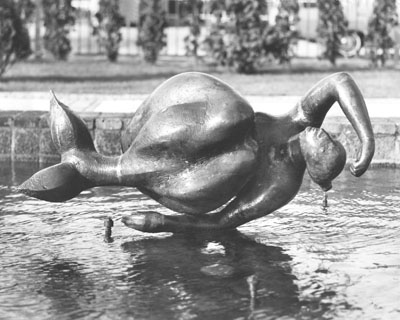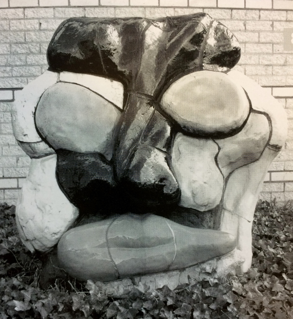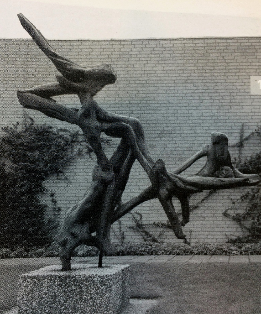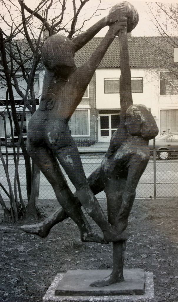 Een klein bronzenbeeldje staande op een slanke smalle pilaar van metaal. Het beeldje is abstract en ziet er organisch uit. De meest logische reden waarom dit beeldje verdwenen is, is de kwetsbaarheid door vandalen. Bij de redactie is niet bekend wanneer het beeld verdwenen is en waar het is gebleven.