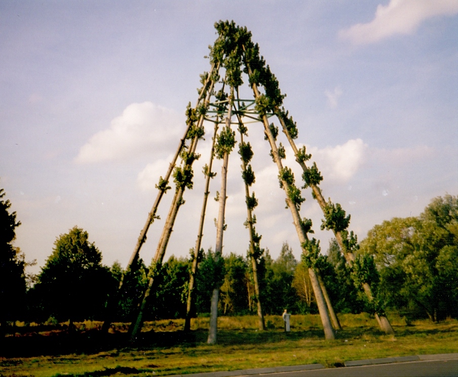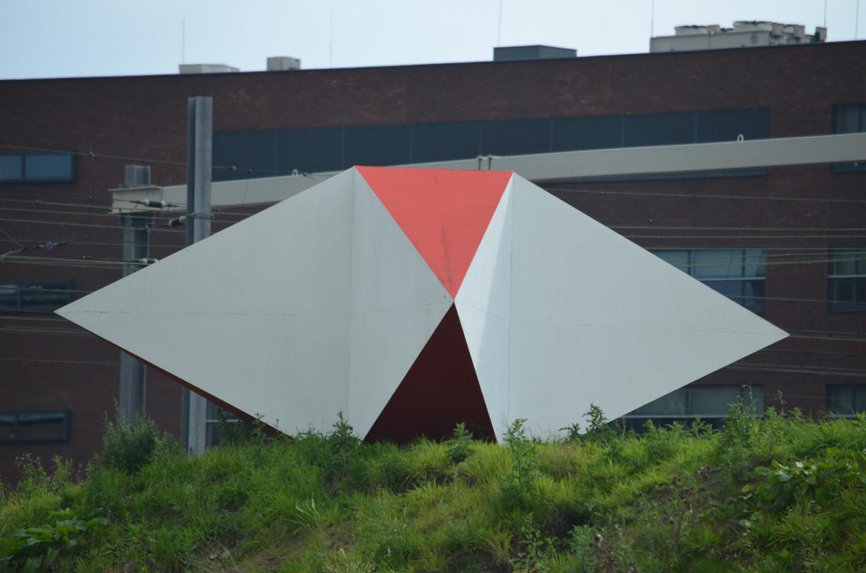 Een rechthoekige stalen sculptuur in de vorm van een dikke stalen balk met twee delen die in de bovenkant omhoogkomen. Bij de redactie is niet bekend wanneer het object verdwenen is en waar het is gebleven.
