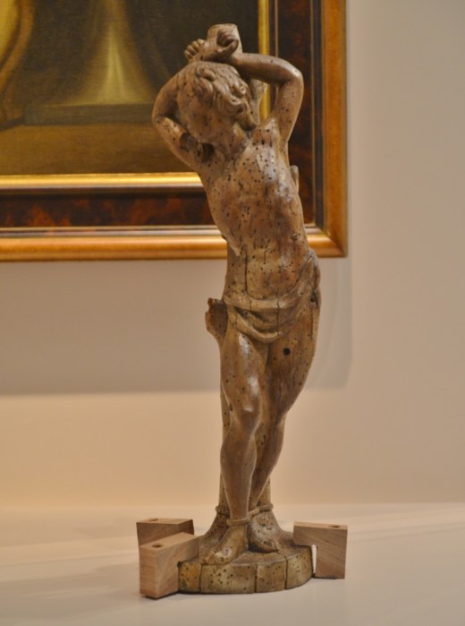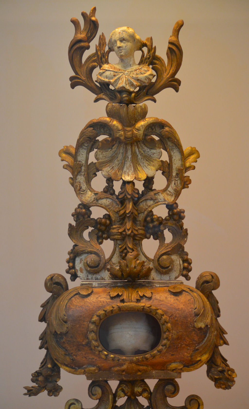 Achter het ovale venster ligt de schedel van een soldaat uit het Thebaanse Legioen. Rond 285 zette dit Egyptische leger de Romeinen in om christenen te vervolgen. Maar toen de soldaten zich zelf tot het christendom bekeerden, werd het complete legioen omgebracht wegens ontrouw aan de Staat, inclusief hun Romeinse aanvoerder Mauritius van Agaunum, die daarmee een populaire christelijke martelaar werd. Misschien is hij hier bovenop voorgesteld, maar het witte borstbeeld kan ook de symbolische verbeelding zijn van de onbekende (Thebaanse) soldaat’.