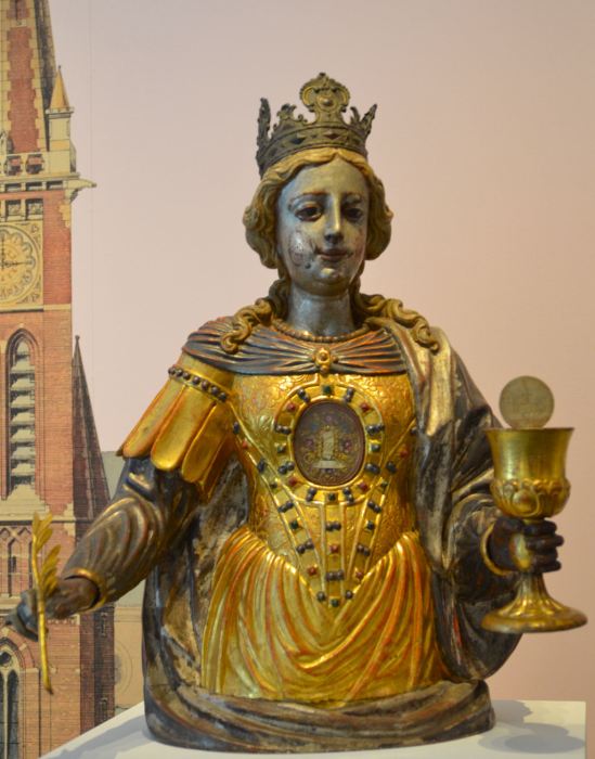 Hier is Barbara weergegeven als reliekhouder; een bewaarplaats voor resten van heilige personen, zoals stukjes bot. De deels verzilverde houten buste lijkt een ‘sprekende’ reliekhouder, die laat zien uit welk lichaamsdeel de reliek afkomstig is. De verpakte reliek in de borstholte van het beeld is mogelijk een stukje rib. In de rechterhand houdt ze als symbool van haar martelaarschap een palmtak vast. De kelk met hostie verwijst naar de eucharistie die een engel haar bracht.