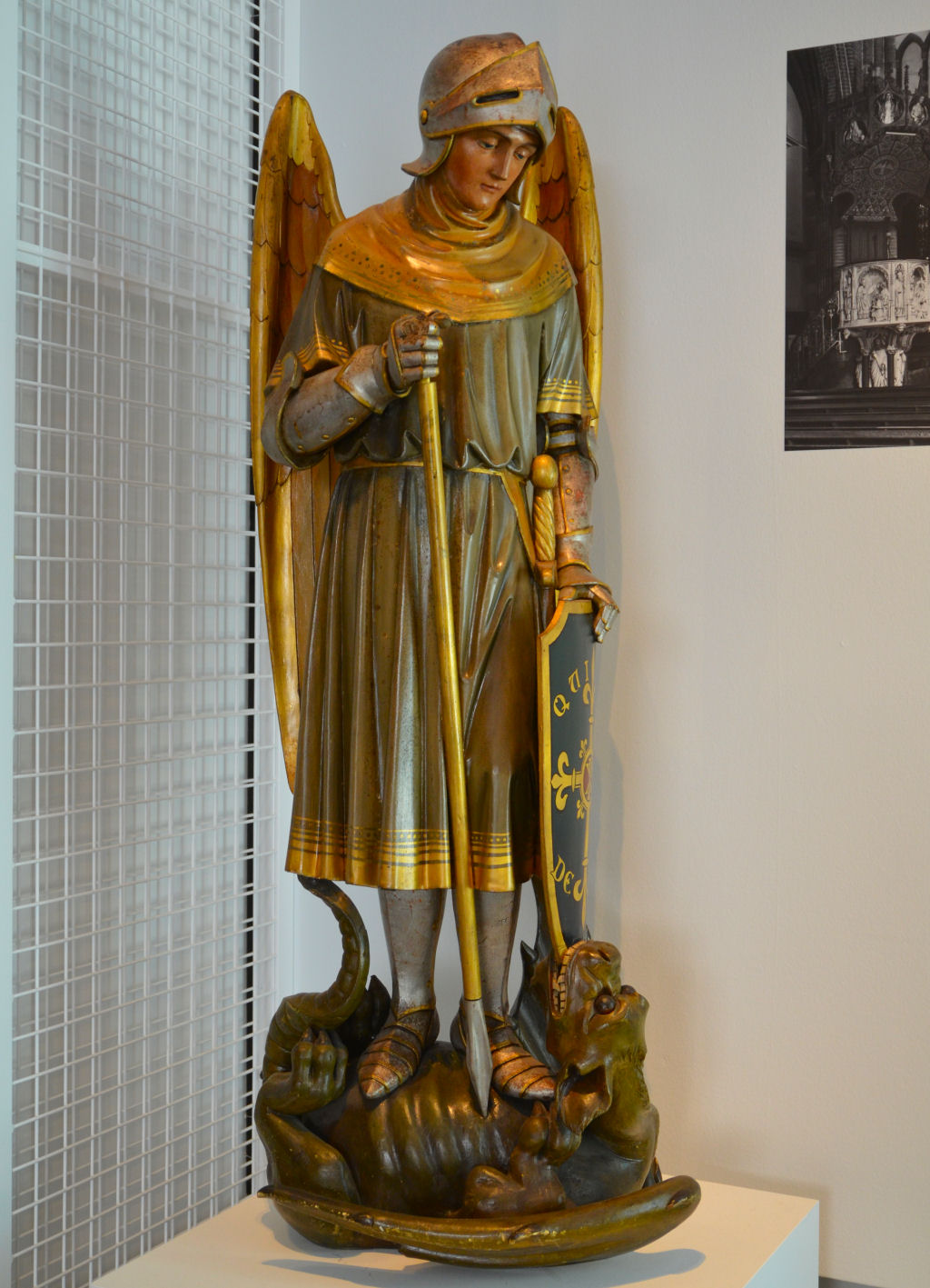 Michaël is een van de drie aartsengelen uit de Bijbel. Als aanvoerder van alle engelen vecht hij tegen het Kwaad: hij verslaat Lucifer in de strijd om het lijk van de profeet Mozes en in het Bijbelboek Openbaringen 12:7 wint hij de apocalyptische strijd tegen de draak. Als heilige wordt hij daarom afgebeeld met de draak aan zijn voeten en met de speer nog in de hand.