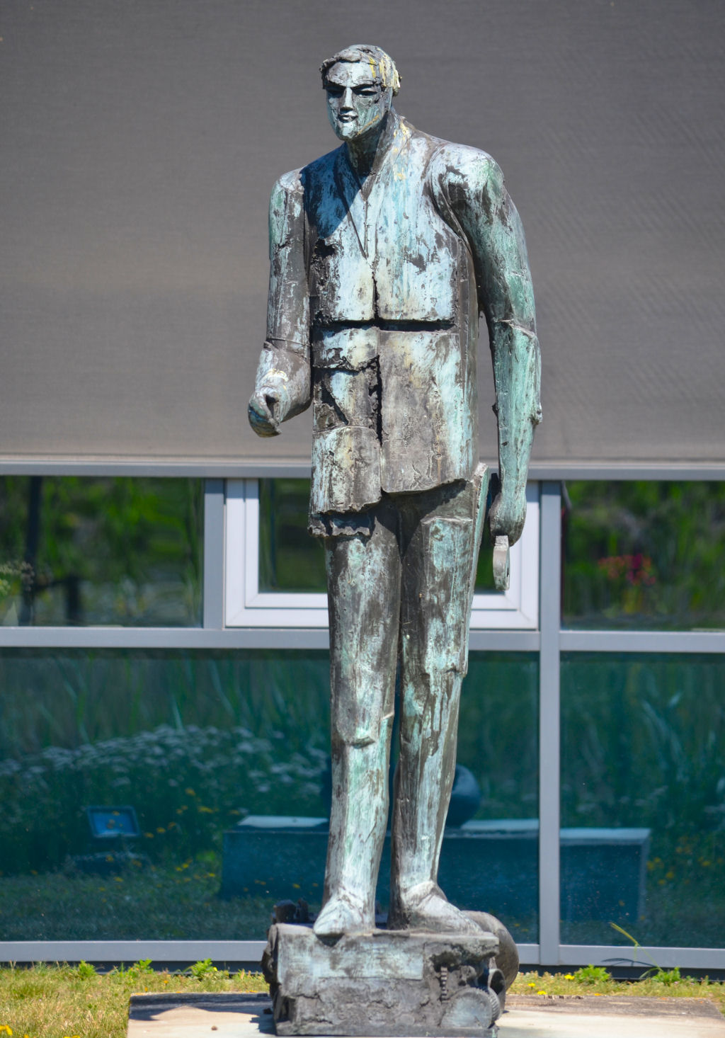 Het werd een man op een paal en de kunstenaars noemden hem “Gardenuit”. De afgeronde top van de paal raakt het ronde hoofd van de man. Hij staat op zijn kop en op de paal staat van boven naar beneden in hoofdletters zijn naam. Er is nóg een paal, daar staat geen man op en ook geen naam maar horizontale streepjes, als op een meetlat.