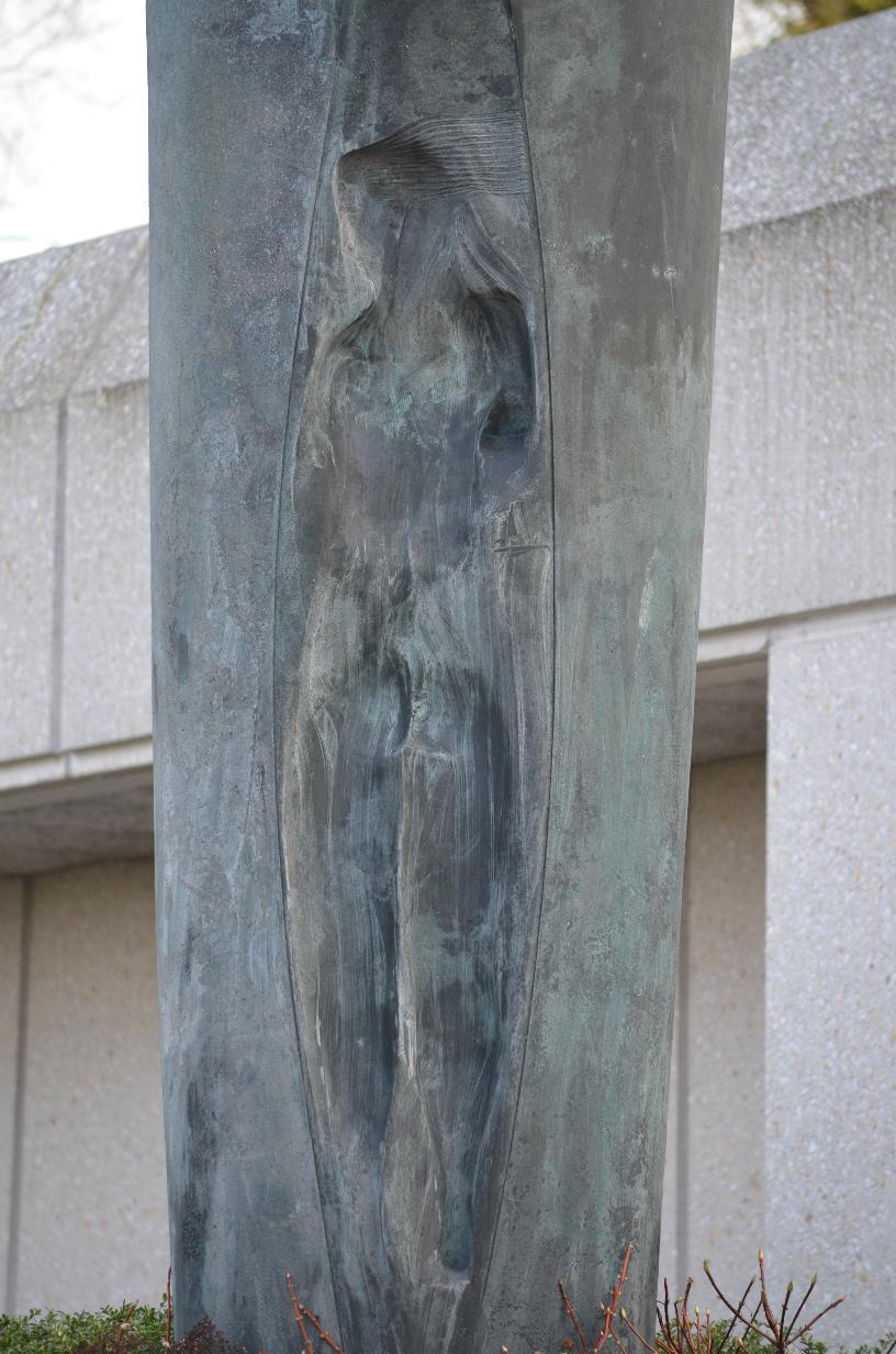 In het vat, de hoge zuil naast de 2 mensenfiguren, zijn lichaamsvormen zichtbaar, sporen van de achtergebleven ongrijpbare hoop. De man en de vrouw zijn tekens van de aarzeling als voorwaarde voor iedere ontwikkeling. De kunstenaar heeft geprobeerd de spanning tussen onzekerheid van de hoop en het rustgevende vertrouwen gestalte te geven.