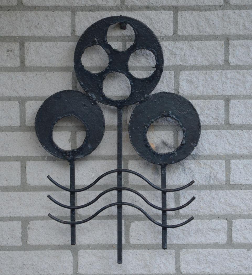 Eenvoudig sculptuur van metaal aan gevel.