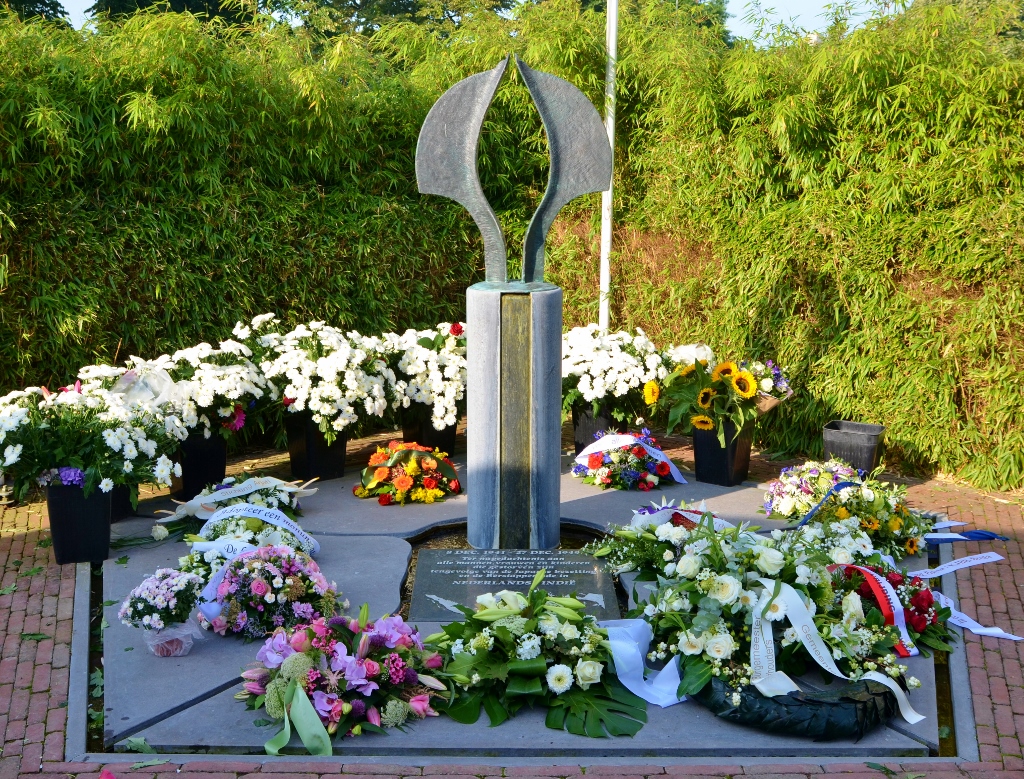De bronzen sculptuur symboliseert twee mensen, die de Tweede Wereldoorlog en de Bersiapperiode in het voormalige Nederlands-Indië hebben overleefd en naar elkaars verhaal luisteren. De open ruimte tussen de twee figuren verwijst naar de verloren tijd die door de oorlog in ieders leven is ontstaan. Een verloren tijd, die een gemis aan liefde en geborgenheid met zich mee bracht. Aan de voet van de sokkel ontspringt een waterpartij. Het water herinnert aan de watervallen in het voormalige Nederlands-Indië en aan de bevloeiing van de sawah’s. Tevens staat het stromende water symbool voor het doorgeven van onze cultuur en levenservaringen aan een volgende generatie en daarmee voor de kringloop van het leven. De gedenksteen onder het beeld wordt gezien als een herinnering en eerbetoon aan de vele overledenen en als erkenning van het leed dat zij hebben moeten doorstaan. De sierbestrating voor het monument herinnert aan de terrasvormige sawah’s. De gedenksteen is onthuld in 2004 en in 2006 aan het ‘Indië-monument’ toegevoegd.