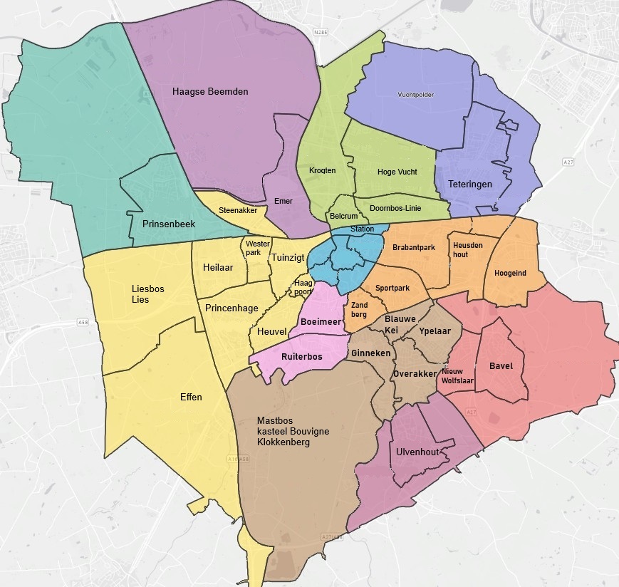 Deze plattegrond geeft een overzicht van de wijken in Breda en haar randdorpen. Het biedt hulp bij het vinden van de kunstwerken, omdat alle kunstwerken ingedeeld zijn per wijk.