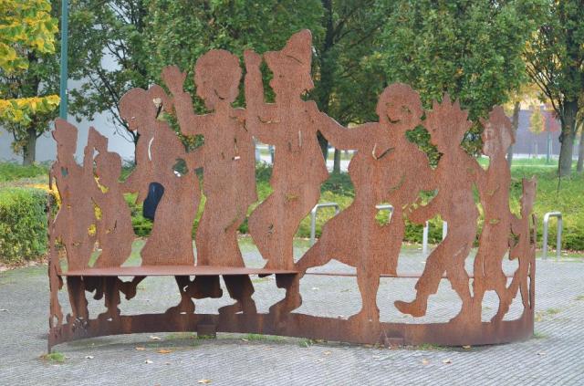 Omschrijving: sculptuur in staal met 9 carnavalvierders