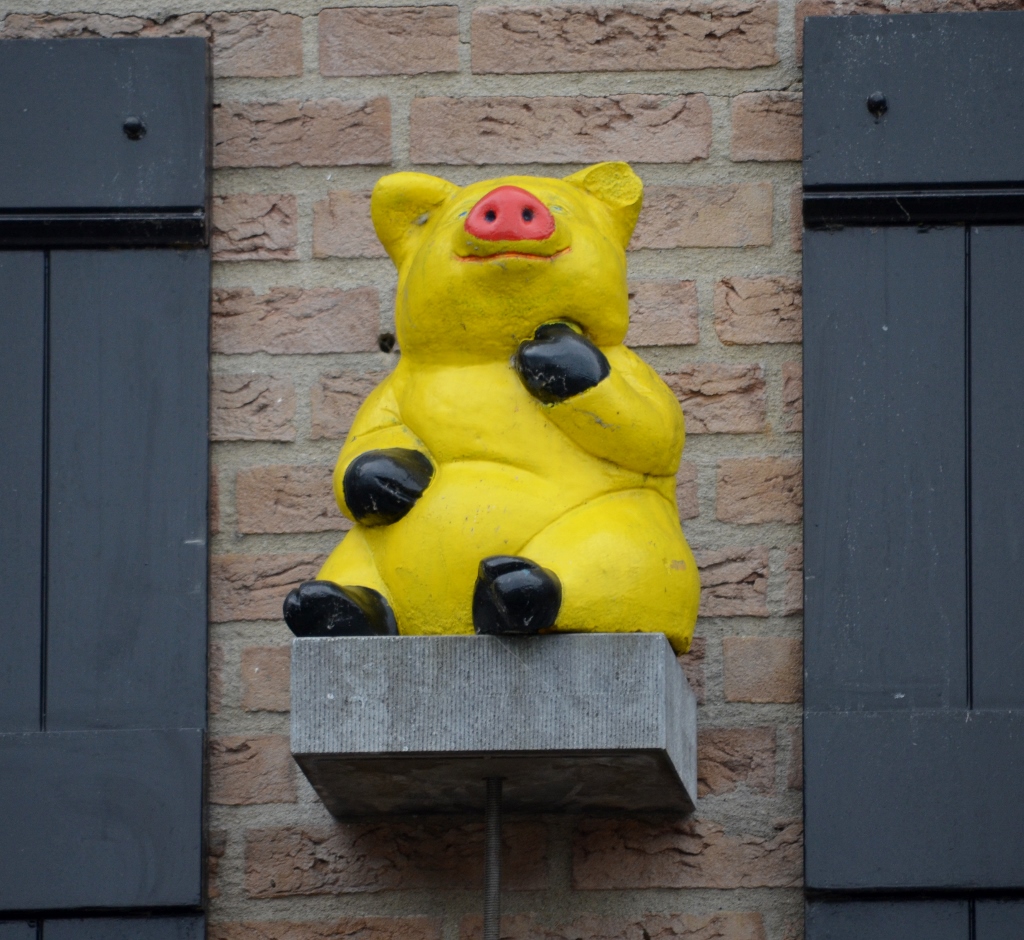Bij Herberg De Swaen aan de Markt 29 bevindt zich eveneens een beeldje van een varkentje, maar dat beeldje is nog kleiner en niet zo mooi geel geschilderd, zie hieronder.