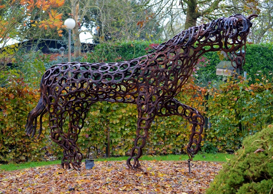 Dit beeld van een paard is geheel opgebouwd uit honderden hoefijzers die aan elkaar zijn gelast.