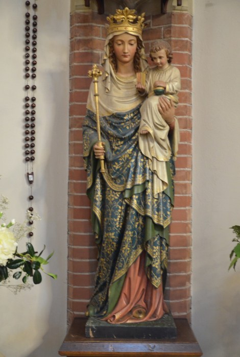 Maria werd onmiddellijk na haar dood in de hemel opgenomen en door God tot koningin gekroond. Ze heeft een kroon op haar hoofd en draagt een scepter. Een scepter (of schepter) is een staf, meestal voorzien van een dikker uiteinde aan de bovenkant, die geldt als machtsymbool van een godheid, koning of keizer en daarom tot de regalia behoort. Traditiegetrouw draagt Maria kind Jezus op de linkerarm. Haar rode ondergewaad duidt op haar waardigheid God te hebben mogen dragen, de blauwe mantel geeft haar menselijkheid aan.