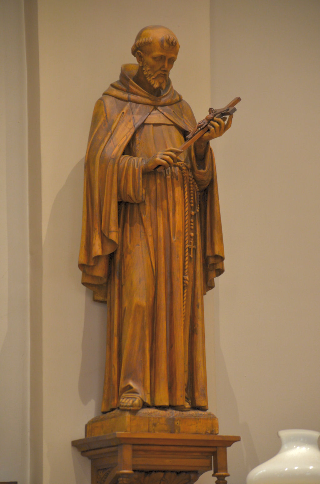 Franciscus is afgebeeld in habijt (of pij) van de door hem gestichte orde. De pij reikt tot de voeten en wordt bijeengehouden door een koord. Aan het koord hangt links een ketting met een christuskruis en een van de uiteinden van het koord met daarin diverse knopen. De stof is van iets dikkere, grove textiel met een hoofdkap. Hij draagt sandalen waarbij de rechtervoet onder de pij uitsteekt.