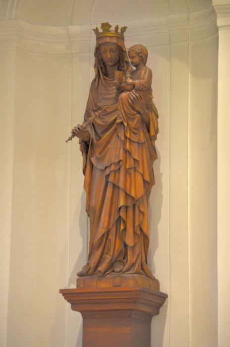 Maria werd onmiddellijk na haar dood in de hemel opgenomen en door God tot koningin gekroond. Ze heeft een kroon op haar hoofd en draagt een scepter. Een scepter (of schepter) is een staf, meestal voorzien van een dikker uiteinde aan de bovenkant, die geldt als machtssymbool van een godheid, koning of keizer en daarom tot de regalia behoort. Op haar arm draagt ze Kind Jezus. De rijke draperieën en het zeer hoog gehouden kind zijn kenmerkend voor de 19de-eeuwse neogotiek.